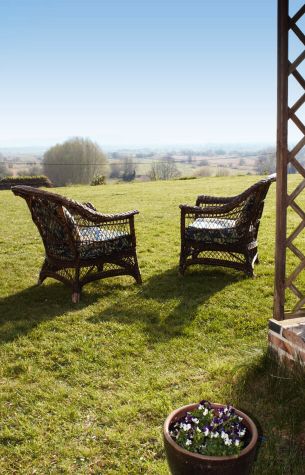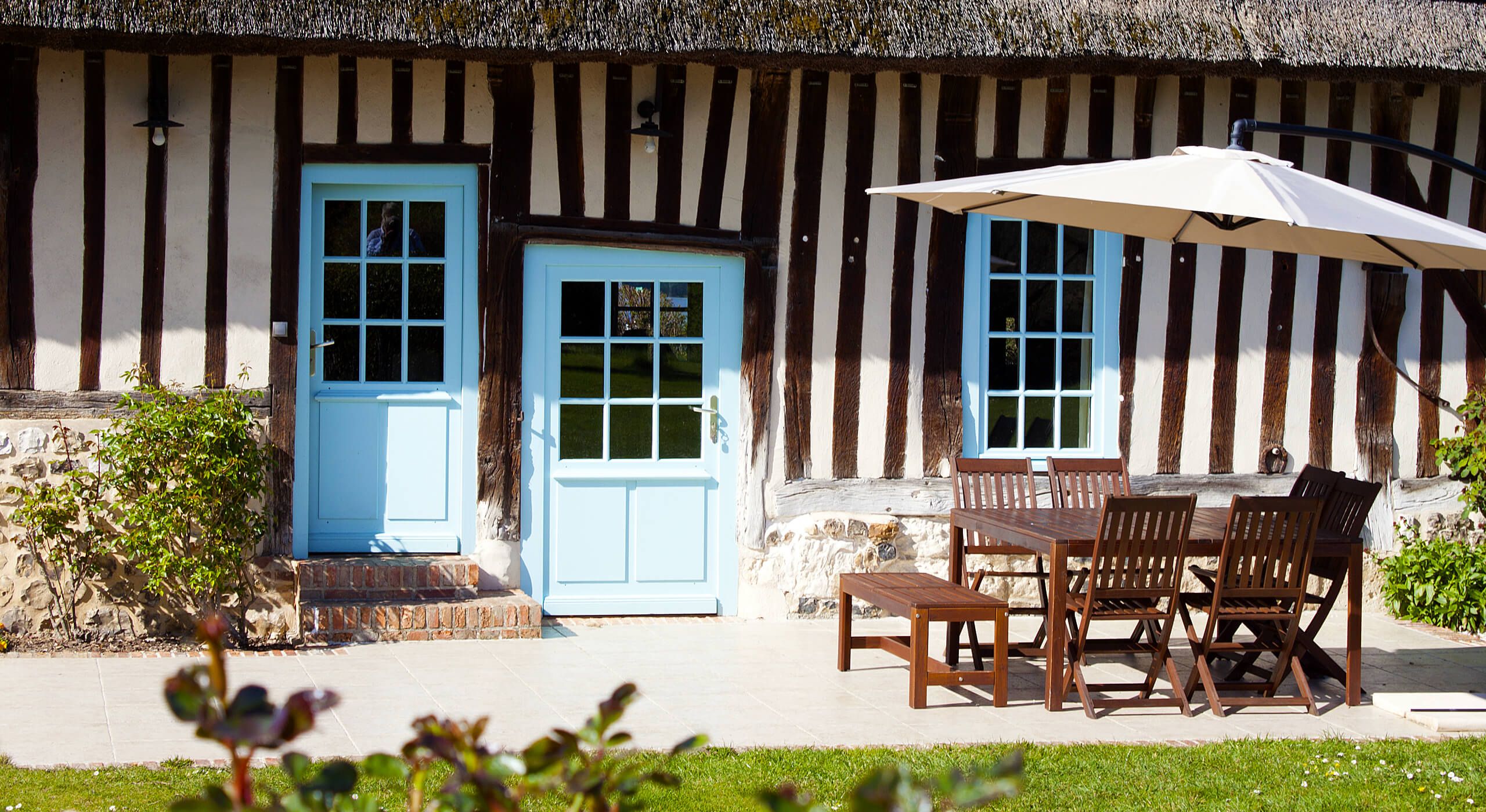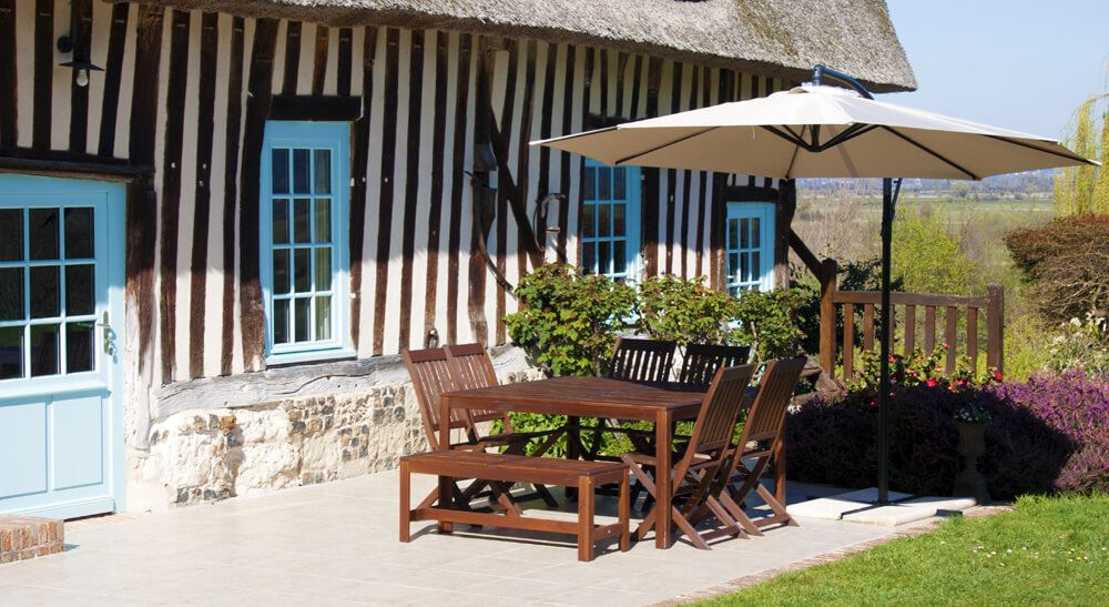 La terrasse extérieure (40 m2) avec sa vue unique sur l’amphithéâtre naturel du Marais-Vernier, est la promesse de doux farniente, de joyeux apéritifs ou de soirées sans fin. En été, elle est couverte d’un large auvent protecteur.